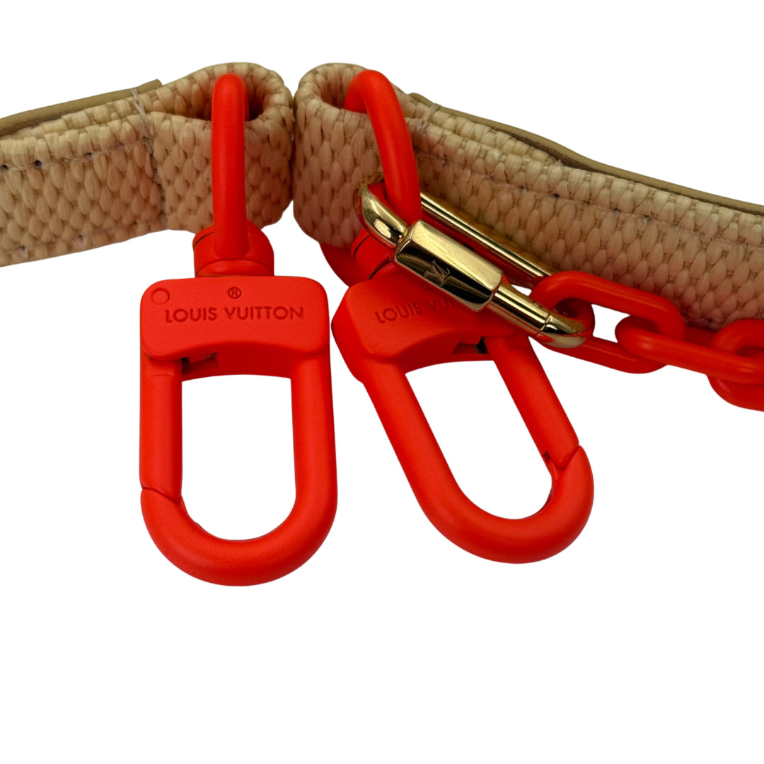 This Louis Vuitton Keepall 50 features a striking limited-edition design crafted in handwoven raffia palm fibers with the iconic Damier pattern rendered in a vivid fluorescent orange tone. The bag showcases a double-sided woven construction, complemented by vegetable-tanned leather handles and color-coated hardware that harmonize seamlessly with the bold exterior.