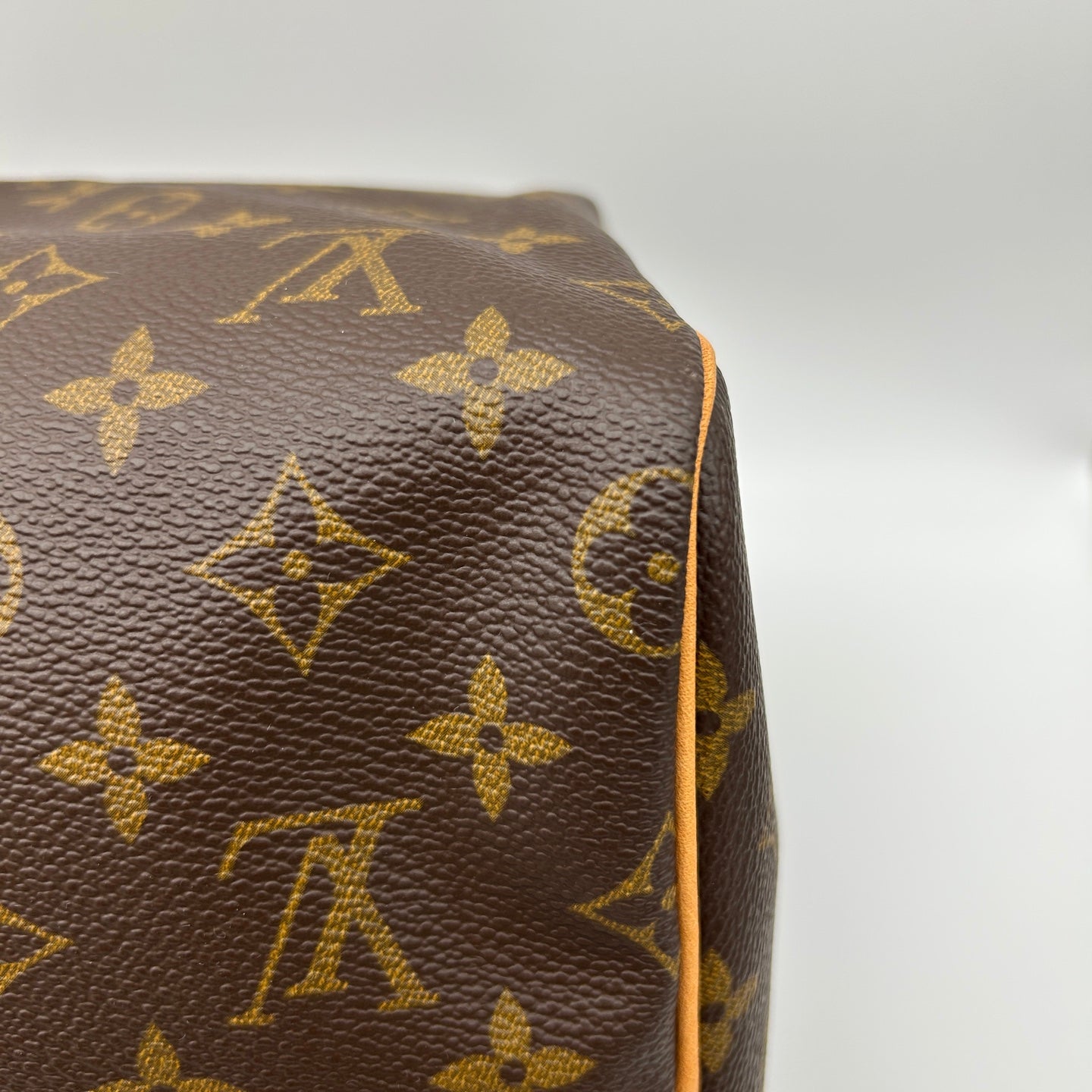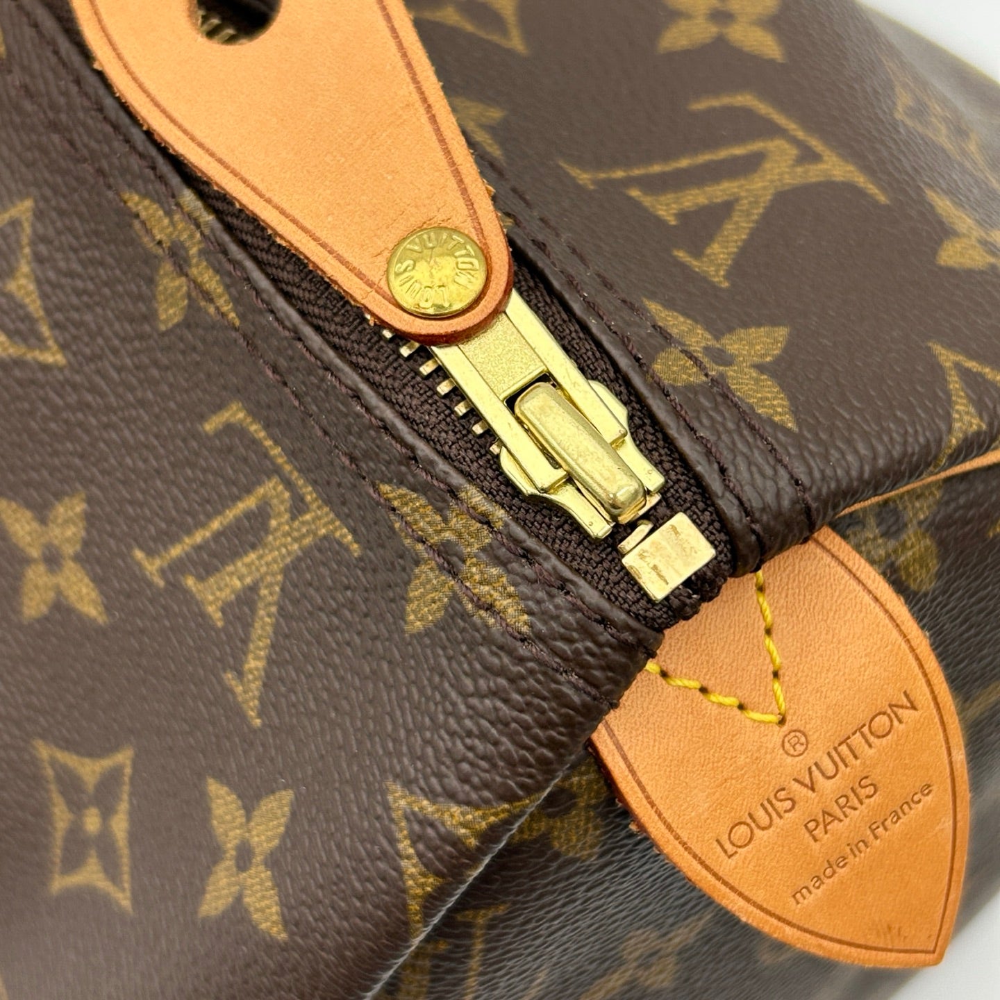This Louis Vuitton Speedy 40 travel bag features the iconic Monogram canvas paired with natural leather trim. The Speedy line is one of Louis Vuitton’s most recognizable and enduring designs, known for its classic silhouette and practicality.