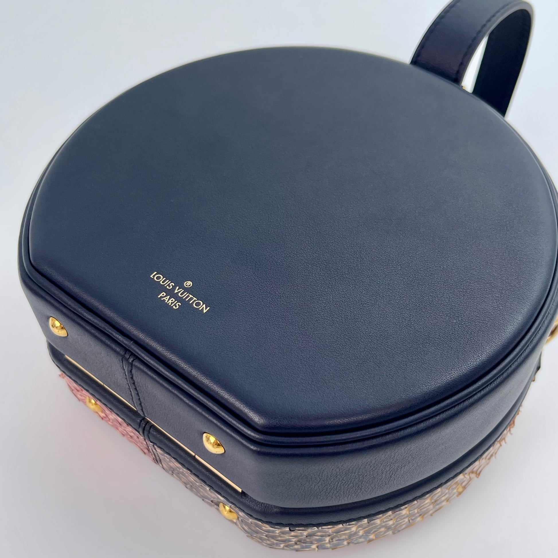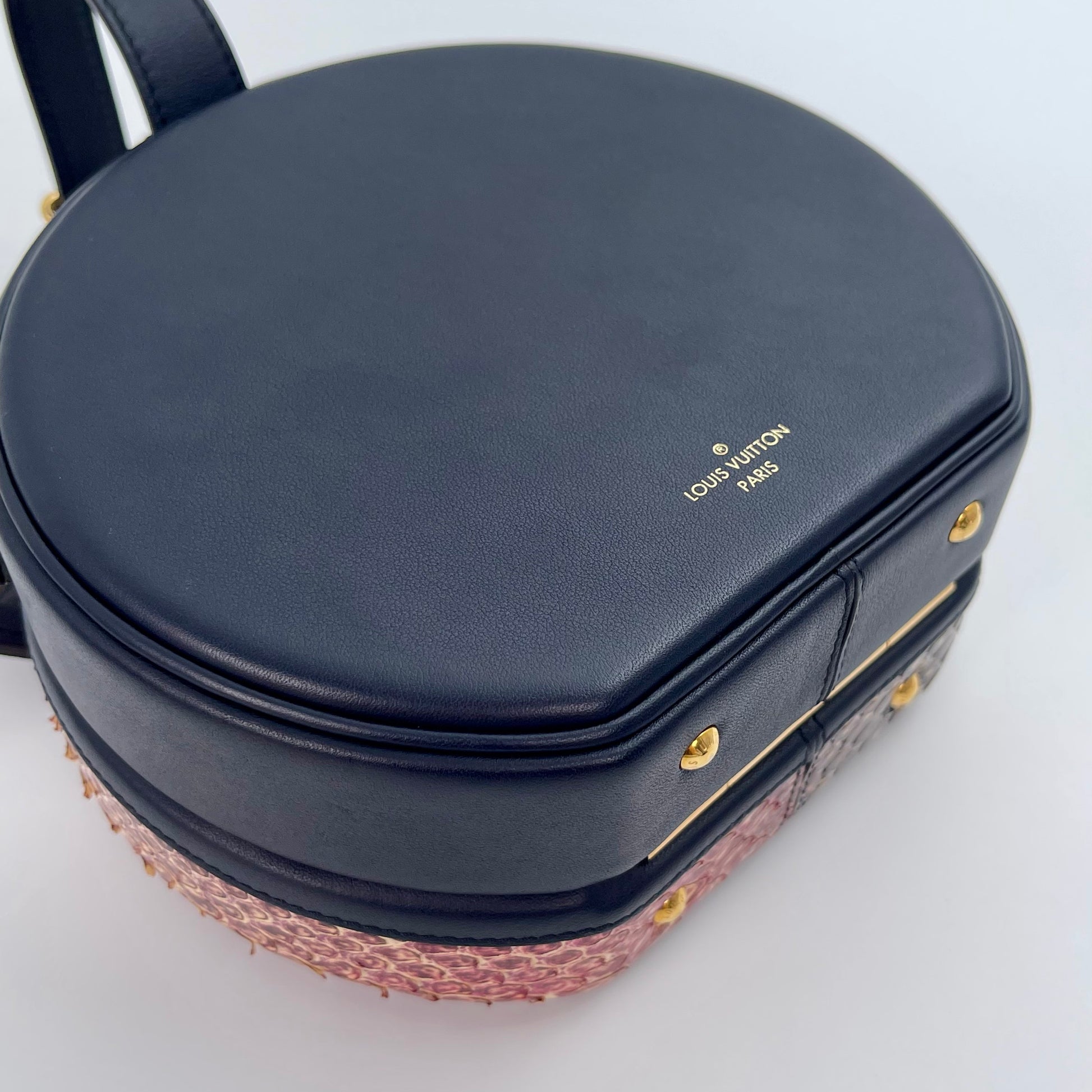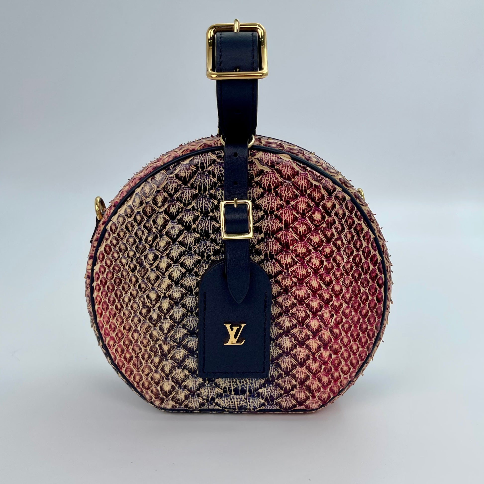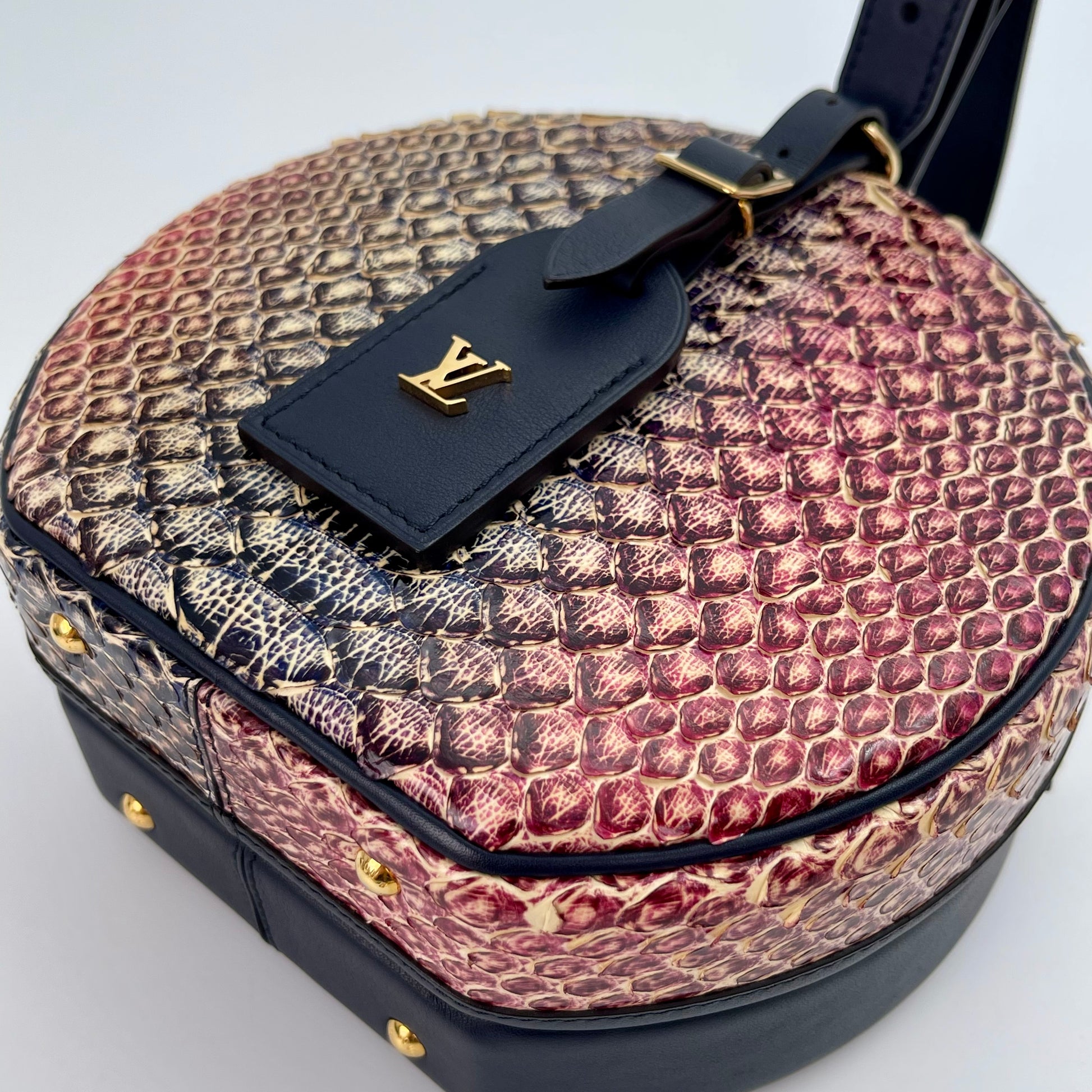 A luxurious and collectible piece from Louis Vuitton, the Petite Boite Chapeau is a modern reinterpretation of the classic hat box silhouette — elevated here in an exotic blend of genuine python skin and soft lambskin leather. This multicolor version brings a bold yet refined character to a compact, statement-making design.