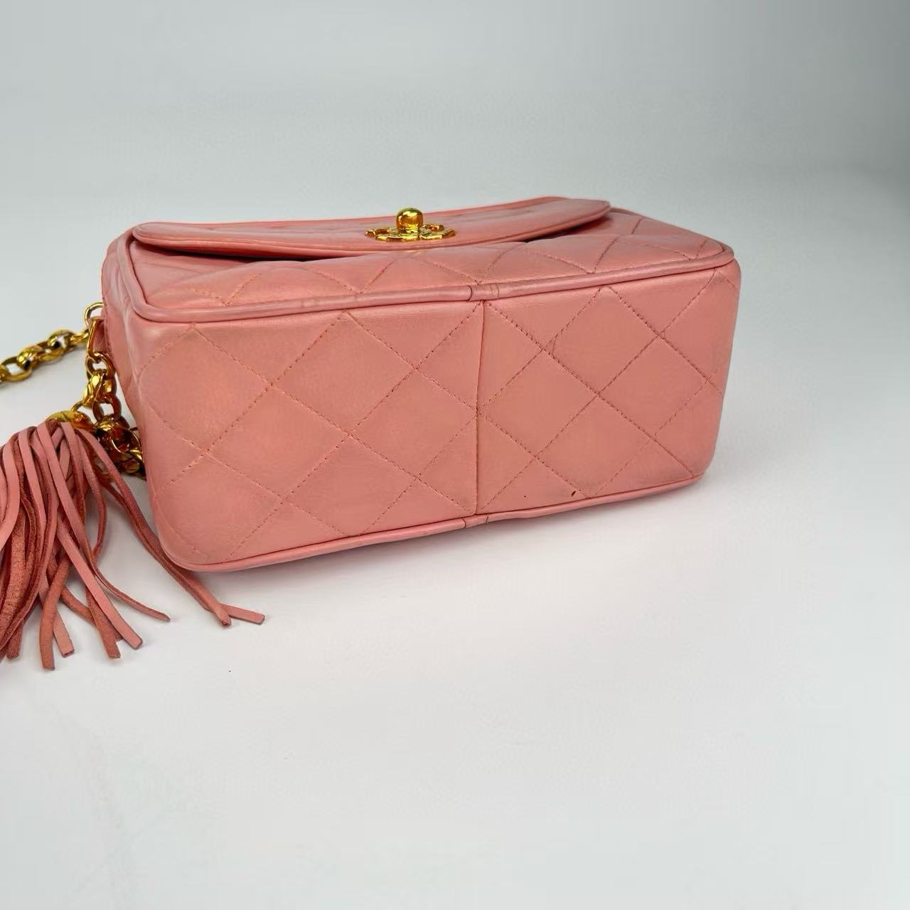 Specifications:Chanel Matelassé Chain Shoulder Bag in lambskin — a rare and elegant mini with fringe detail.